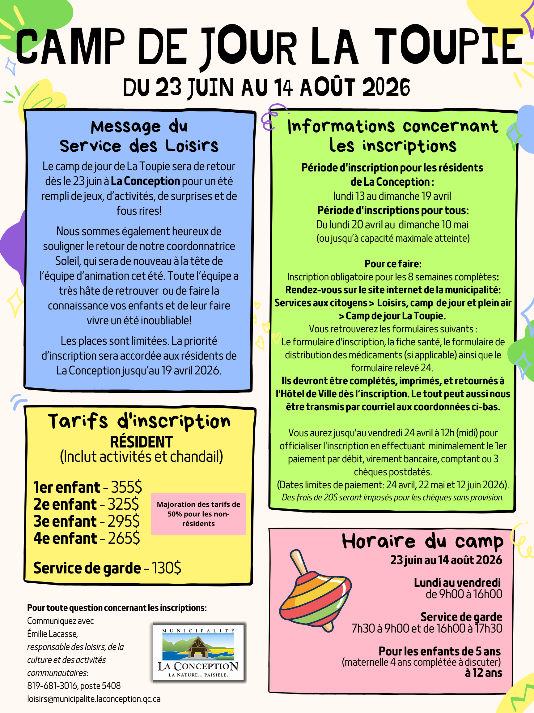 Au besoin, vous pouvez communiquer avec Émilie Lacasse à loisirs@municipalite.laconception.qc.ca ou au 819-681-3016 poste 5408.